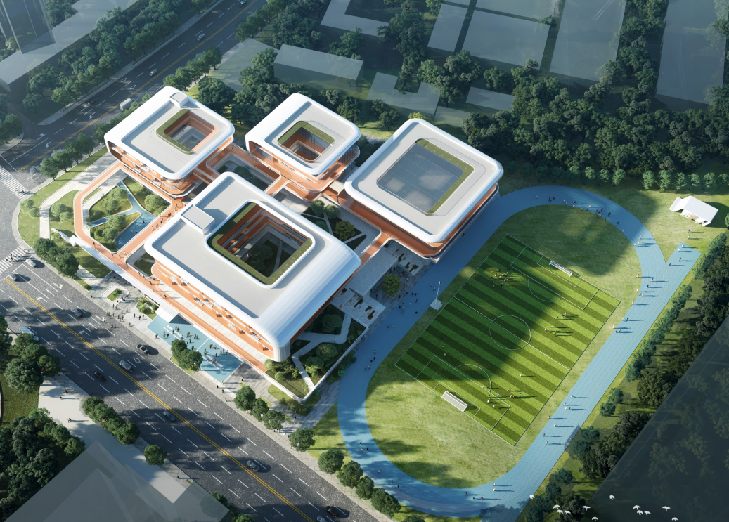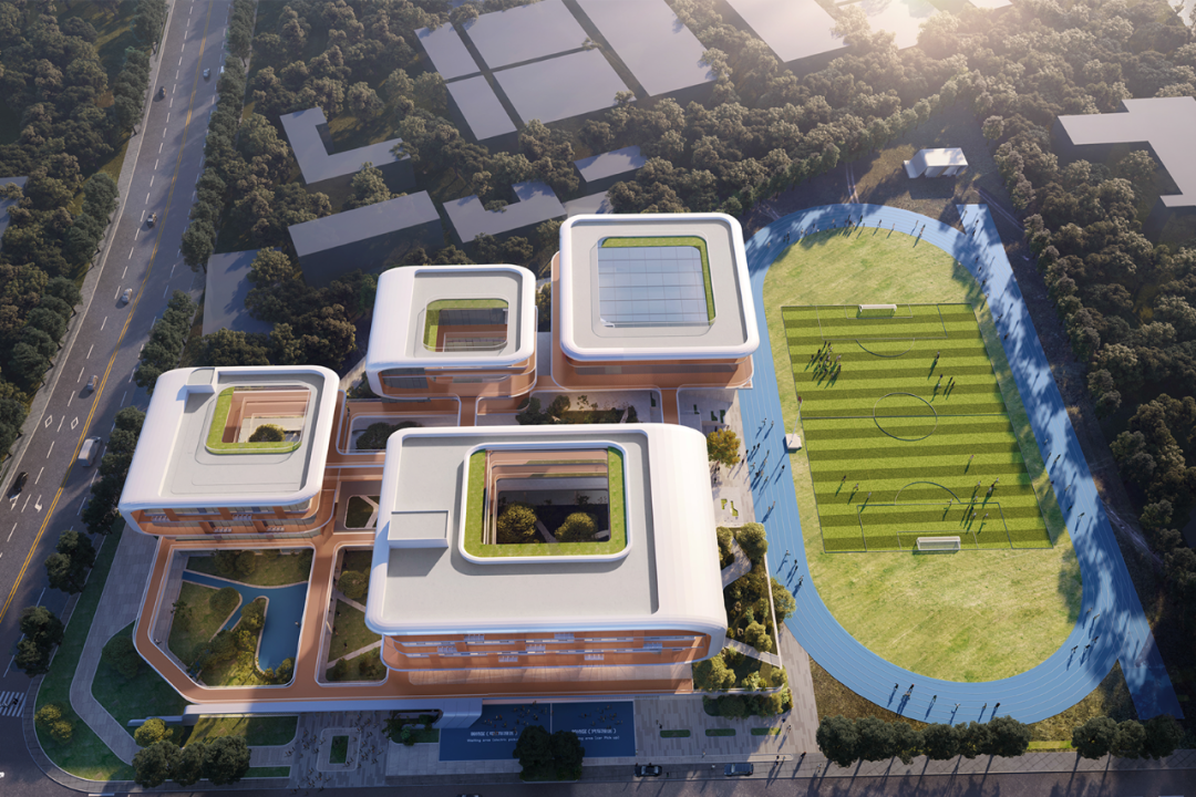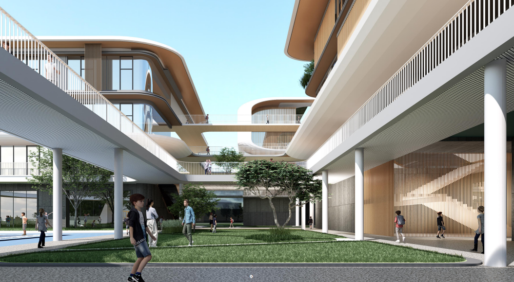项目主要包含两栋5层教学楼、一栋4层教学楼、一栋2层辅助用房(包含风雨操场、食堂)以及报告厅组成,通过立体多维连廊将以上功能区串联在一起。