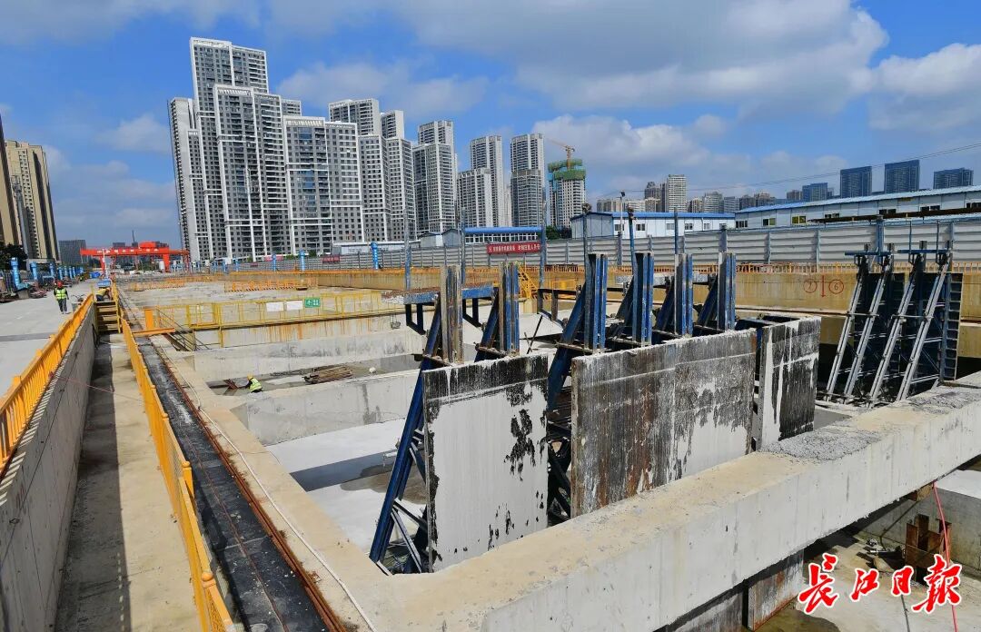 在位于汉阳区四新中路与四新南路交叉路口的施工现场,空中俯瞰车站,像一艘“航母”。武汉地铁股份公司业主代表刘金波介绍,这是一座地下二层车站,总长521.8米,宽21.1米,共设8个出入口。