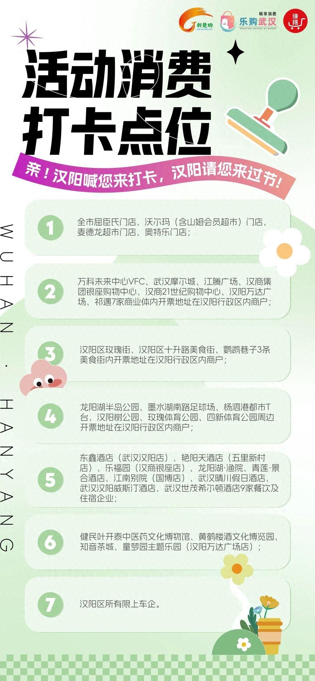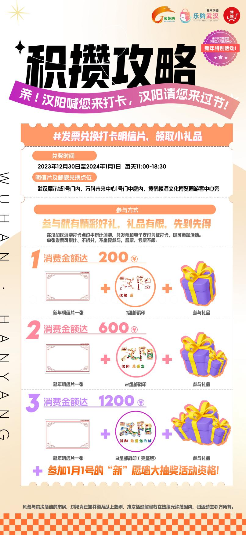 消费者在汉阳区消费打卡点位消费,购物发票金额累计分别达到200元、600元、1200元,可在武汉摩尔城、万科未来中心VFC、黄鹤楼酒文化博览园任一地点现场领取对应等级明信片盖邮戳,凭借带“汉阳”字样的邮戳明信片,现场可领取一份礼品。礼品数量有限,先到先得,兑完为止。