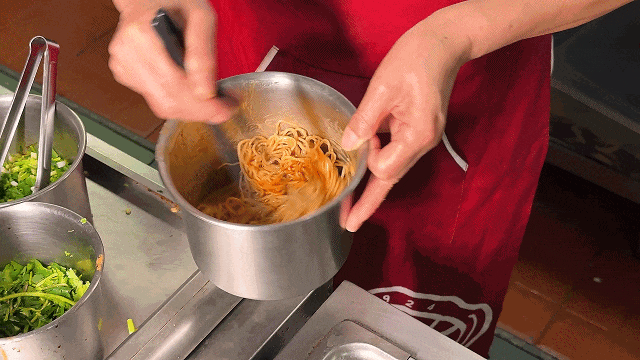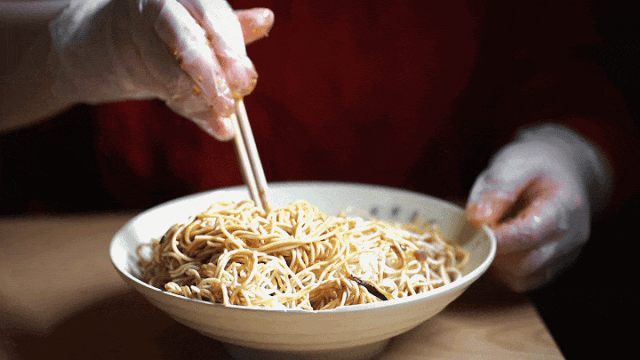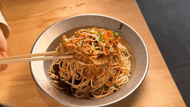 纤细、劲道的碱面条伴着黄瓜丝的清爽,再舀上一勺酥脆的花生碎,香味四溢~几筷子挽进嘴里,配上麻酱的香,嗦完整碗,过瘾!