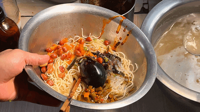 如果觉着不够爽,可以用虾子的酱汁拌凉面吃,浸泡过虾子的酱料混合着凉面,吃过就忘不掉这口~