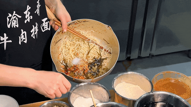 沿着玫瑰街往前走,店面扩大升级后的渝东哥牛肉拌面,刚回归就吸引不少周边居民前来品尝。
