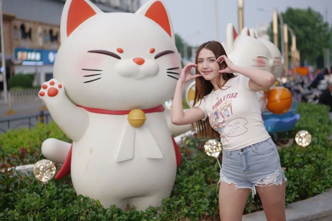 △汉商自主IP汉商猫,位于汉商银座外广场的花坛。