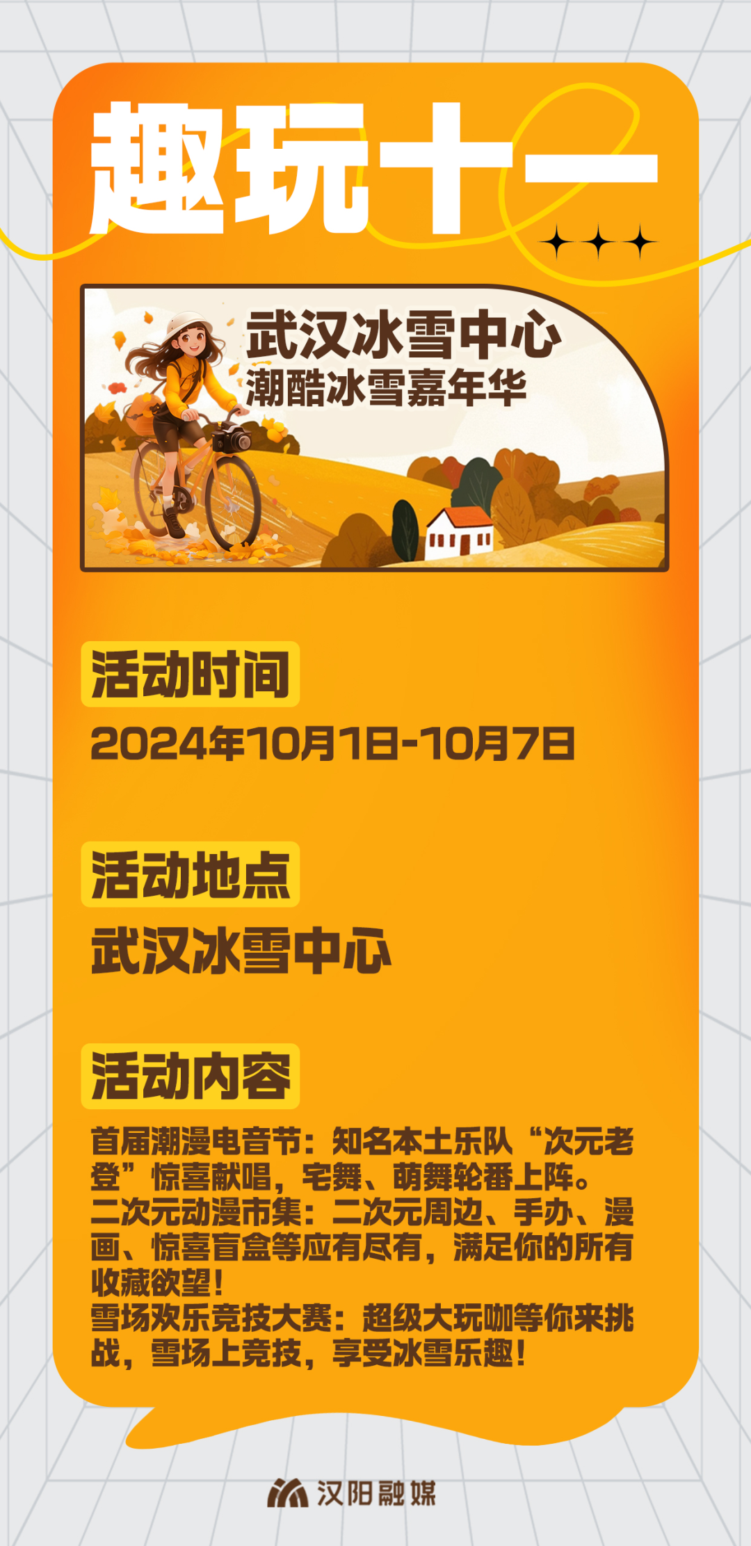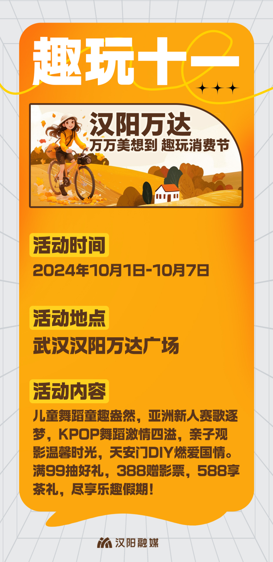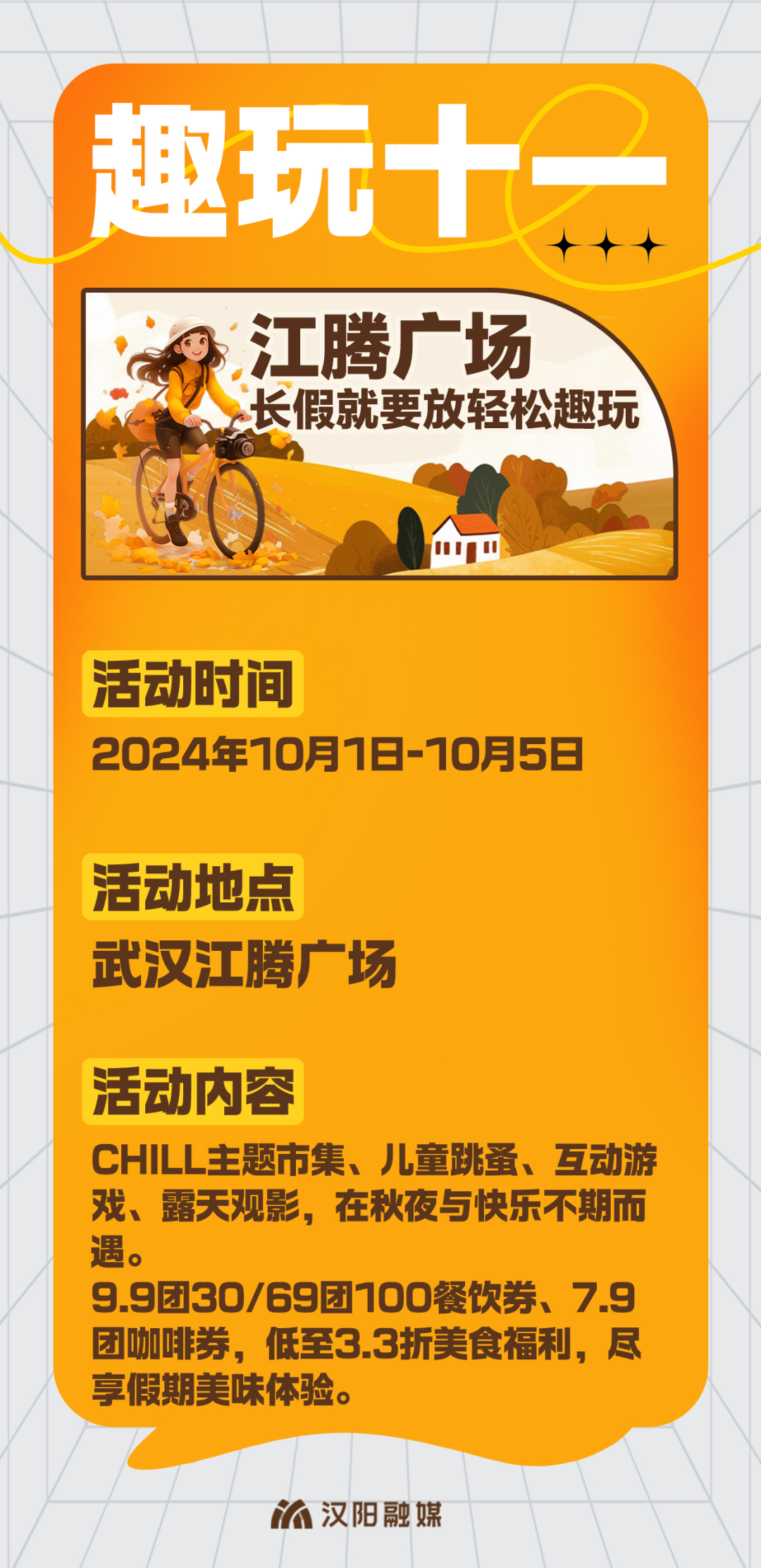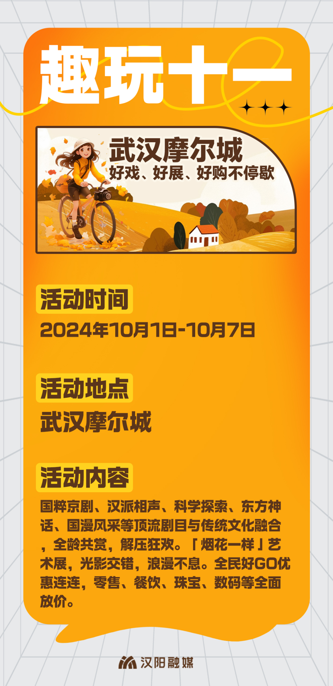 玩乐游购秘籍已解锁,即刻启程!速来汉阳体验一场文艺新潮、治愈解压、亲子互娱的秋日限定浪漫,开启超松弛的假日之旅吧。