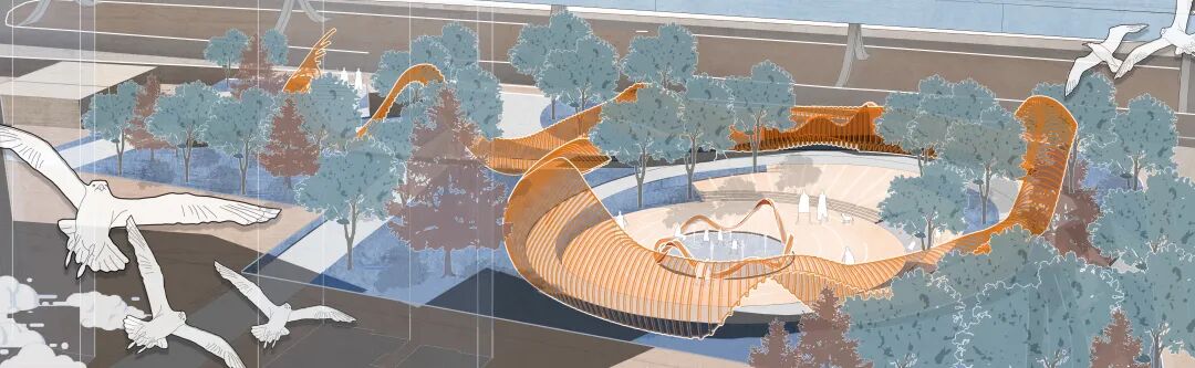 基于设计场地紧邻城市高架桥,高分贝噪音是首要解决的环境问题,华中农业大学依据声景学,借以曲线木廊进行声音的“屏、汇、传”,在有效处理城市噪音的同时,构建丰富的“闻”声空间,以满足邻里日常老人和儿童户外活动需求。