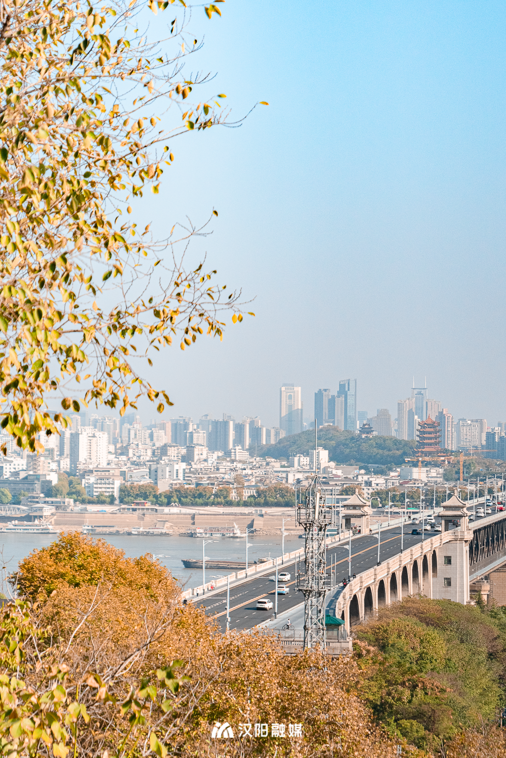 站在龟风飞云观景台,可以看到漫山栾树与黄鹤楼、长江大桥同框的画面,共赏这秋日的浪漫画卷。
