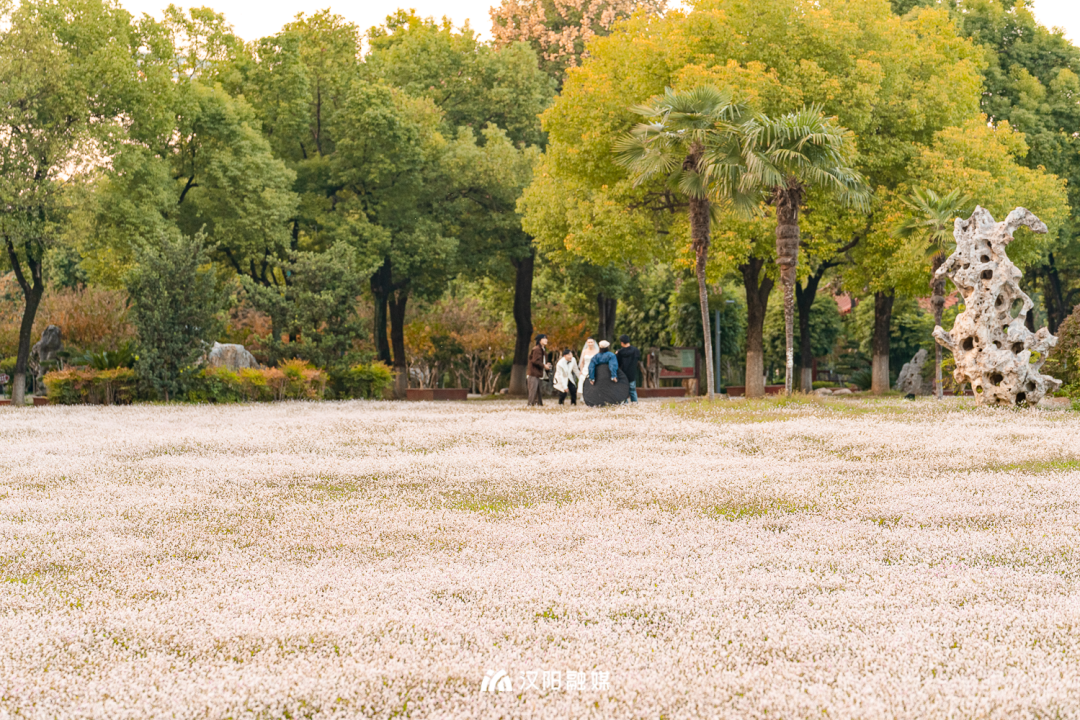 公园里的蓼花现在迎来了盛花期,一朵朵小花在阳光下随风舞动,远远望去,就像一片粉色的海洋,是许多人拍婚纱照的宝藏地点,总有人驻足欣赏。