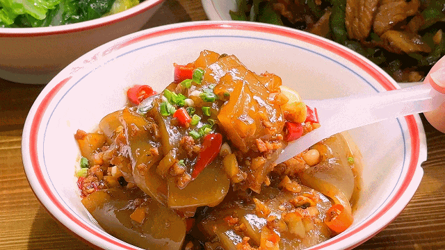 酸菜苕粉皮口感就像果冻一样,Q弹Q弹的,每一片粉皮上都沾满了酸菜和肉末,简直不要太好吃~