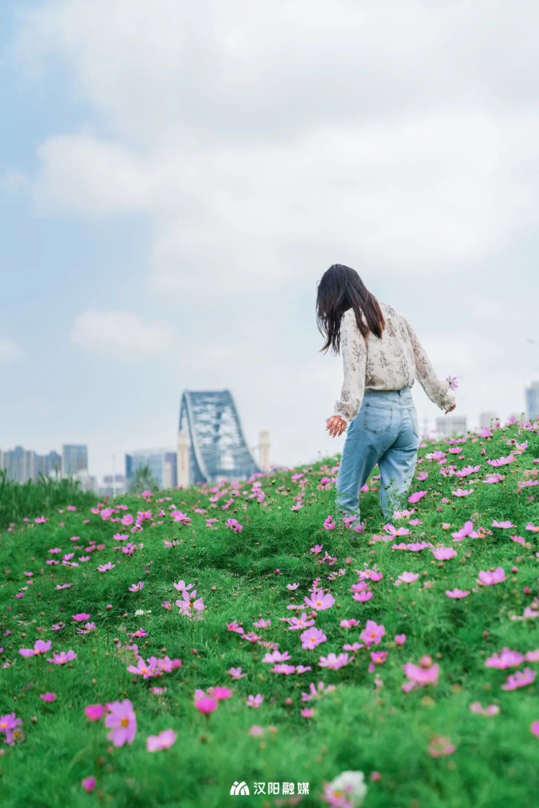 汉江湾桥下,30000平方米的花田花海竞相开放,波斯菊、矢车菊、孔雀草、虞美人……各种野花组合让你仿佛走进了色彩斑斓的秘密花园。