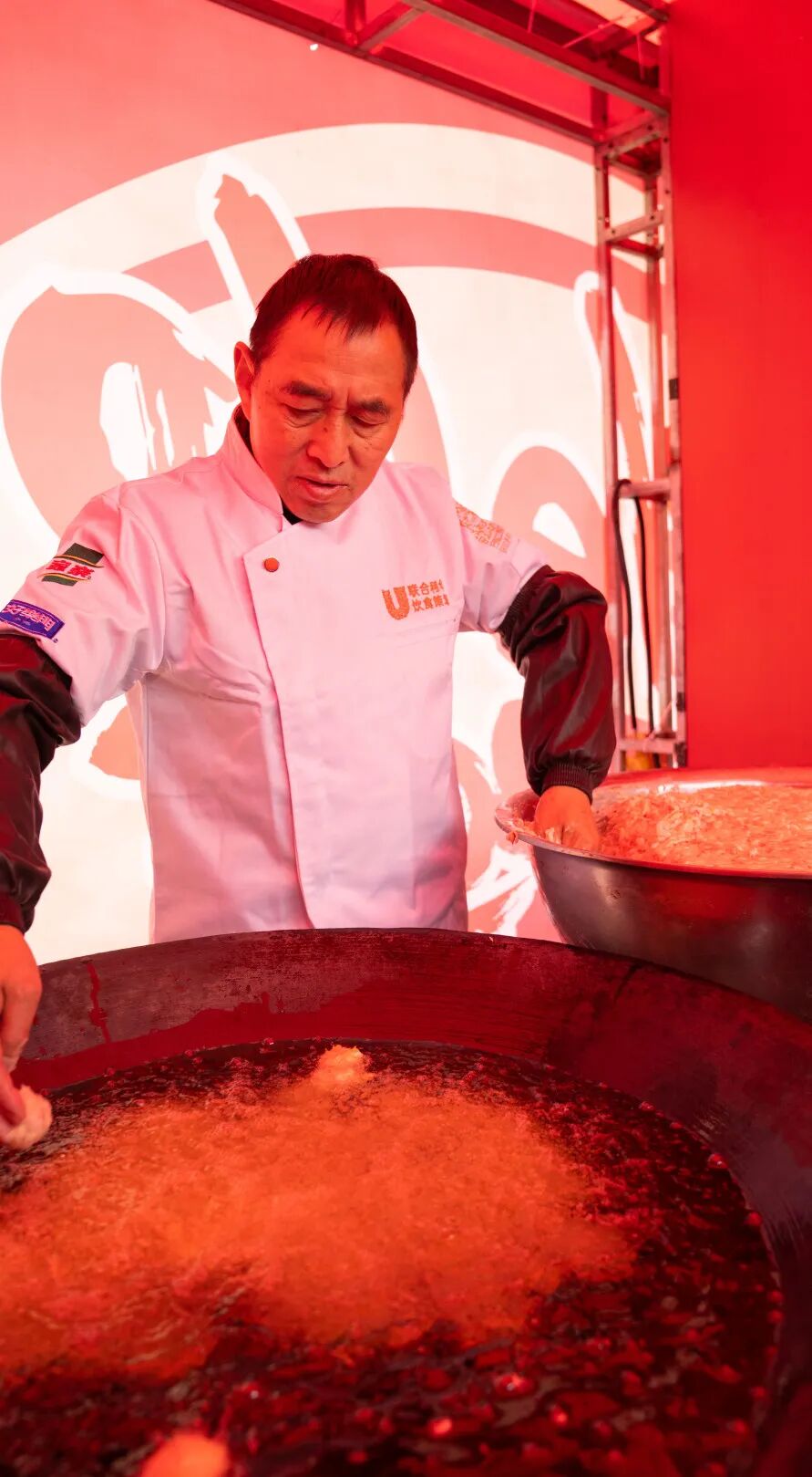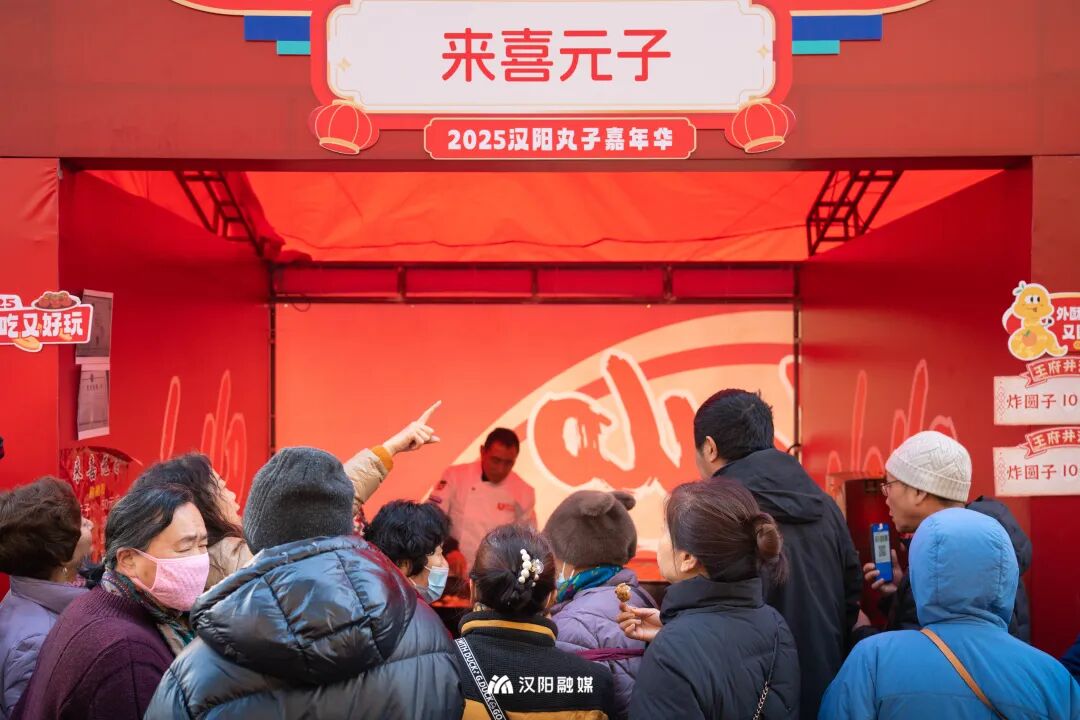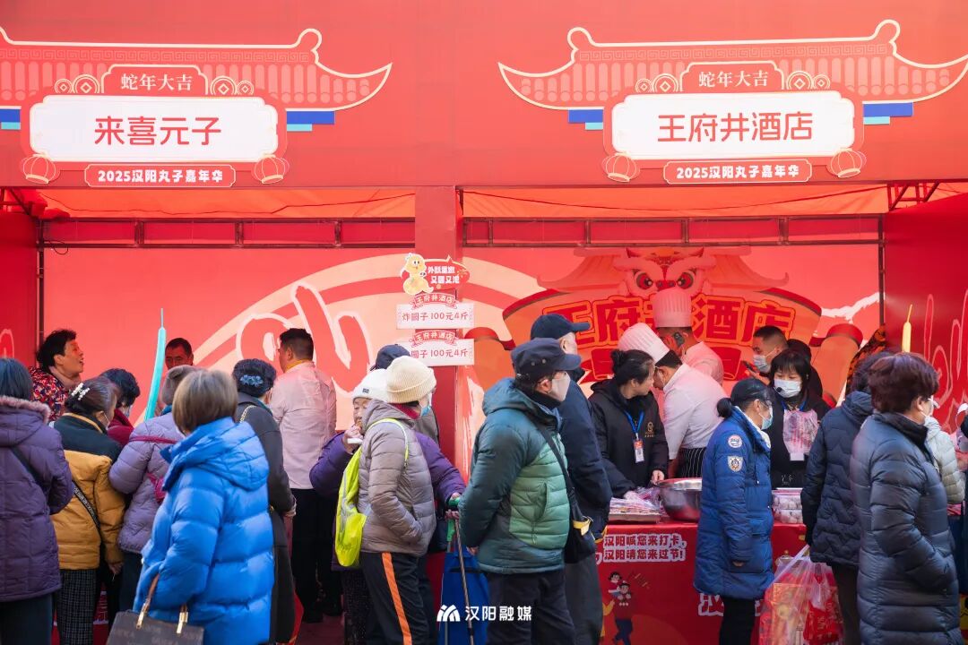 现场,多家汉阳知名圆子企业搭台开炸,马脚、来喜名厨各显神通;王府井、乐福园等多家知名餐饮企业现场售卖各色熟食、年节美味,来往市民沉浸式感受丸子老字号的魅力,集市上人流如织,一片欢腾。