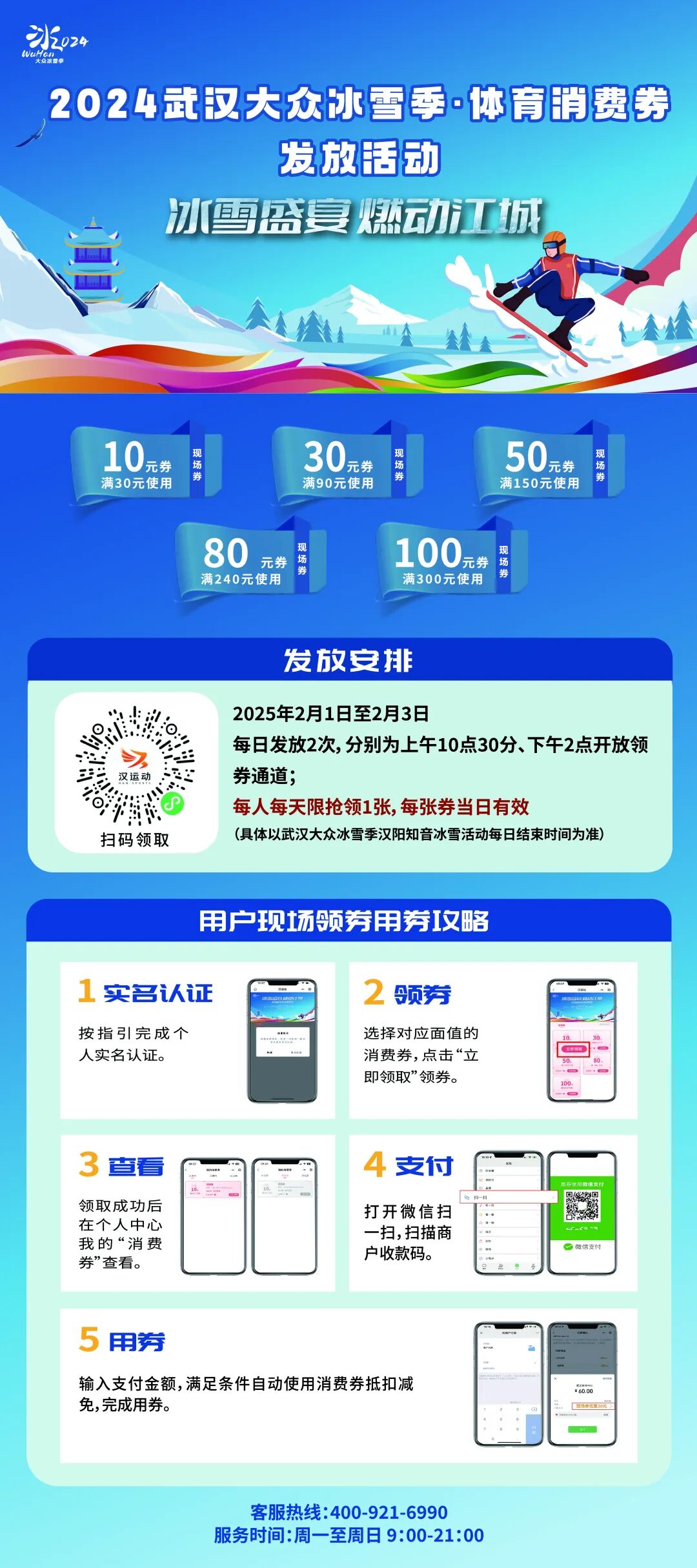 只需通过微信“汉运动”小程序,轻松扫码就能领取到冰雪消费券!这些消费券可以用于场馆消费、青少年开放日活动的培训消费,还能在冰雪嘉年华现场的冰雪体育用品店、美食摊位等十几家商户直接核销使用!