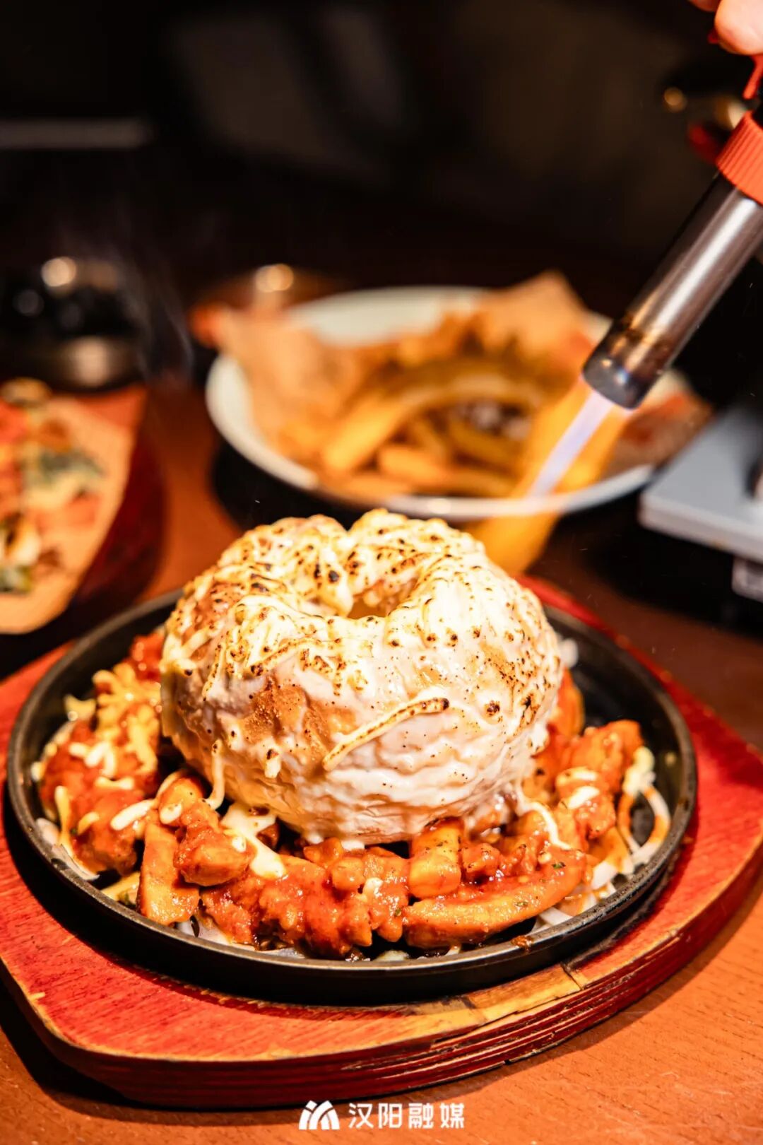熔岩芝士火辣鸡,是这家店的特色。一圈火辣鸡肉包围住中间塞满芝士的面包,店员会现场帮忙烤化芝士,喷枪烤后芝士熔化,轻咬就有汁水喷出。