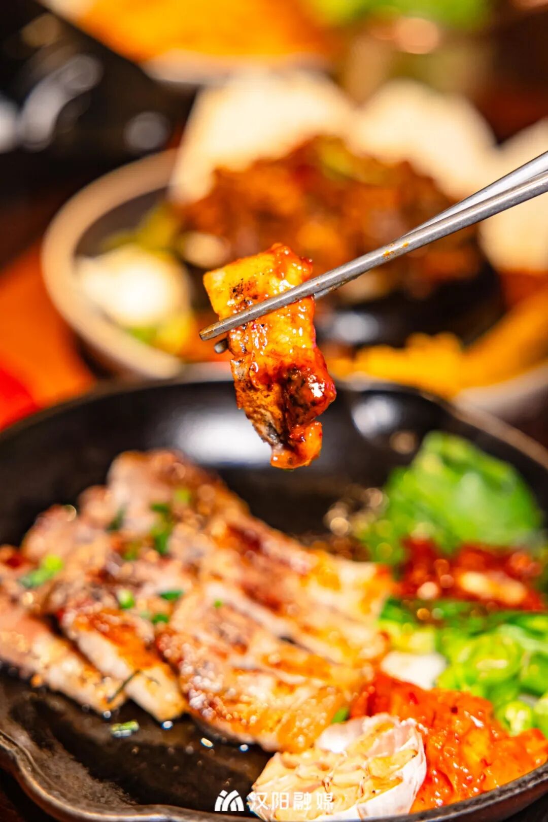 蘸着酱料,裹着生菜,里面加一点大蒜、辣白菜等,按照自己的喜好随意搭配,一口下去简直不要太香,分分钟沦陷在五花肉带给你的幸福里!