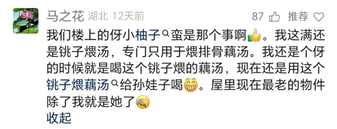 记得小时候,有一个蛮大的沙铫子摆在家里二楼的阳台。过年要煨藕汤了,我的家家要从蛮早就去买藕,买筒子骨。第一天的藕汤味道永远没有第二天的香,再煮点烫饭,翻饺搞两个,就下楼跟兄弟姐妹买比巴卜,甩搭炮。