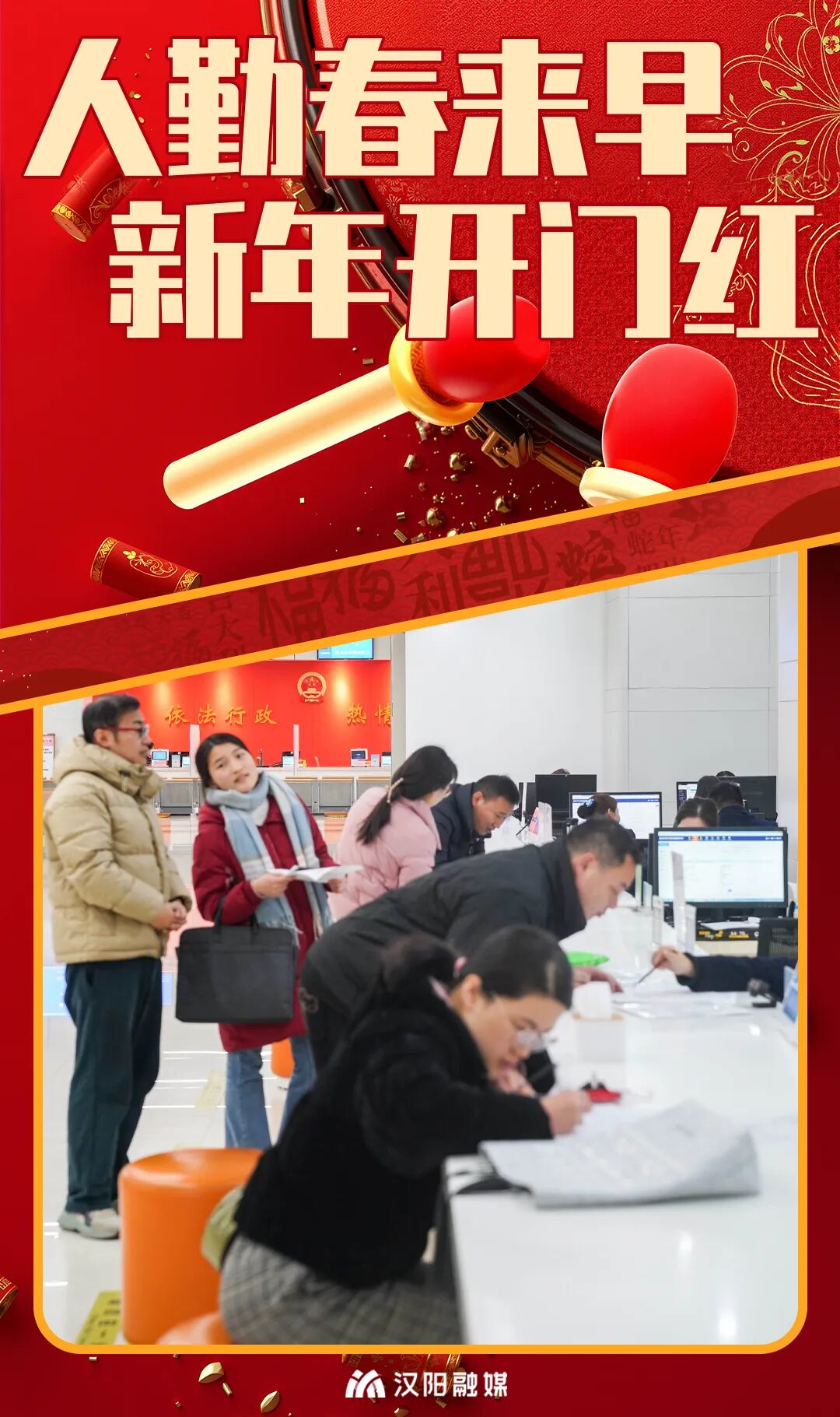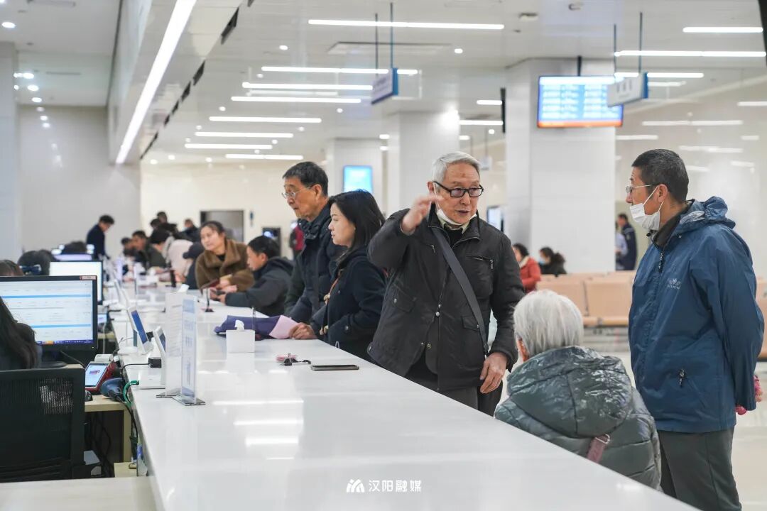 新春开工忙,全力“开门红”。2月7日上午,汉阳区政务服务中心大厅人流络绎不绝,在不动产、医保社保、企业开办等窗口前,群众正有序排号办理业务,全体人员以饱满的工作热情、优质高效的服务迎接新年“开门红”。