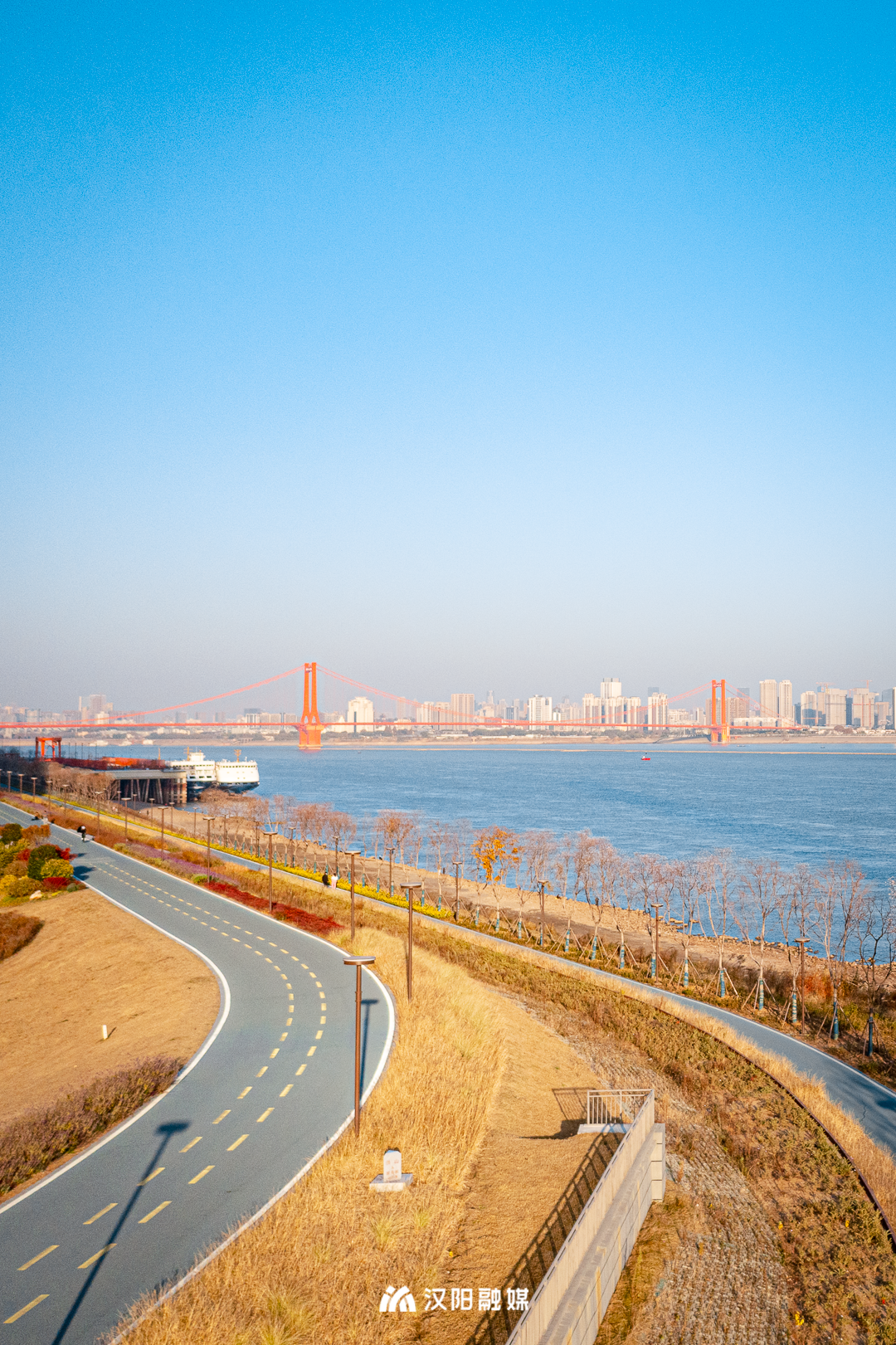 汉江边,枯水期展露出大片的沙滩,蓝天与江水相呼应,每一帧都像是在“海边”。