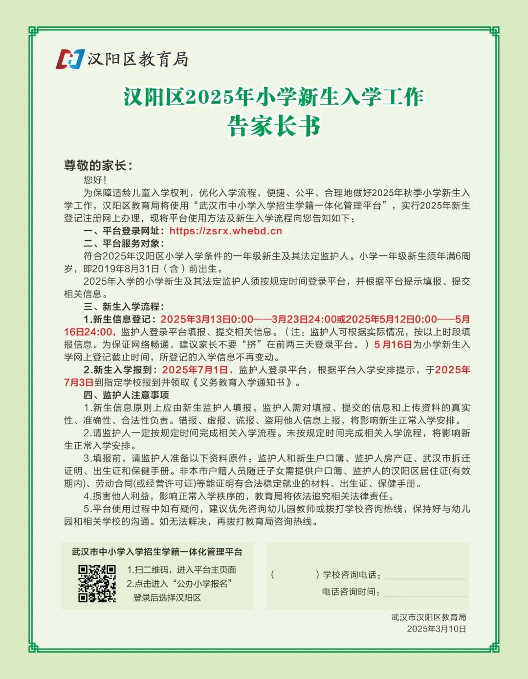 3、非本市户籍随迁子女需额外提供:汉阳区居住证(有效期内)、劳动合同(或经营许可证等合法稳定就业证明)。扰乱入学秩序者,教育局将依法追究责任。