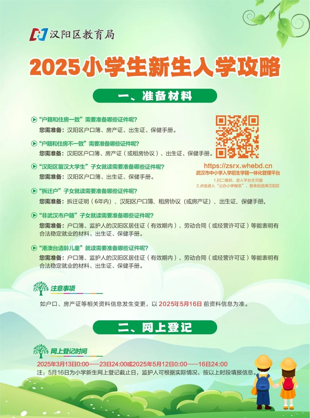 为保障适龄儿童入学权利,优化入学流程,便捷、公平、合理地做好2025年秋季小学新生入学工作,汉阳区教育局将使用“武汉市中小学入学招生学籍一体化管理平台”,实行2025年新生登记注册网上办理。现将平台使用方法及新生入学流程向您告知如下: