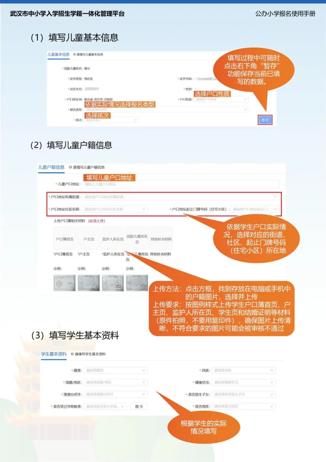 2、需准备的资料原件:监护人和新生户口簿、监护人房产证、武汉市拆迁证明、出生证、保健手册。