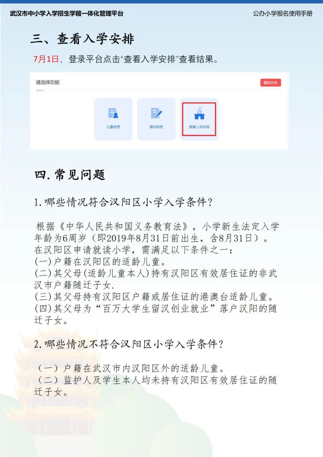 02平台服务对象:符合2025年汉阳区小学入学条件的一年级新生及其法定监护人。小学一年级新生须年满6周岁,即2019年8月31日(含)前出生。