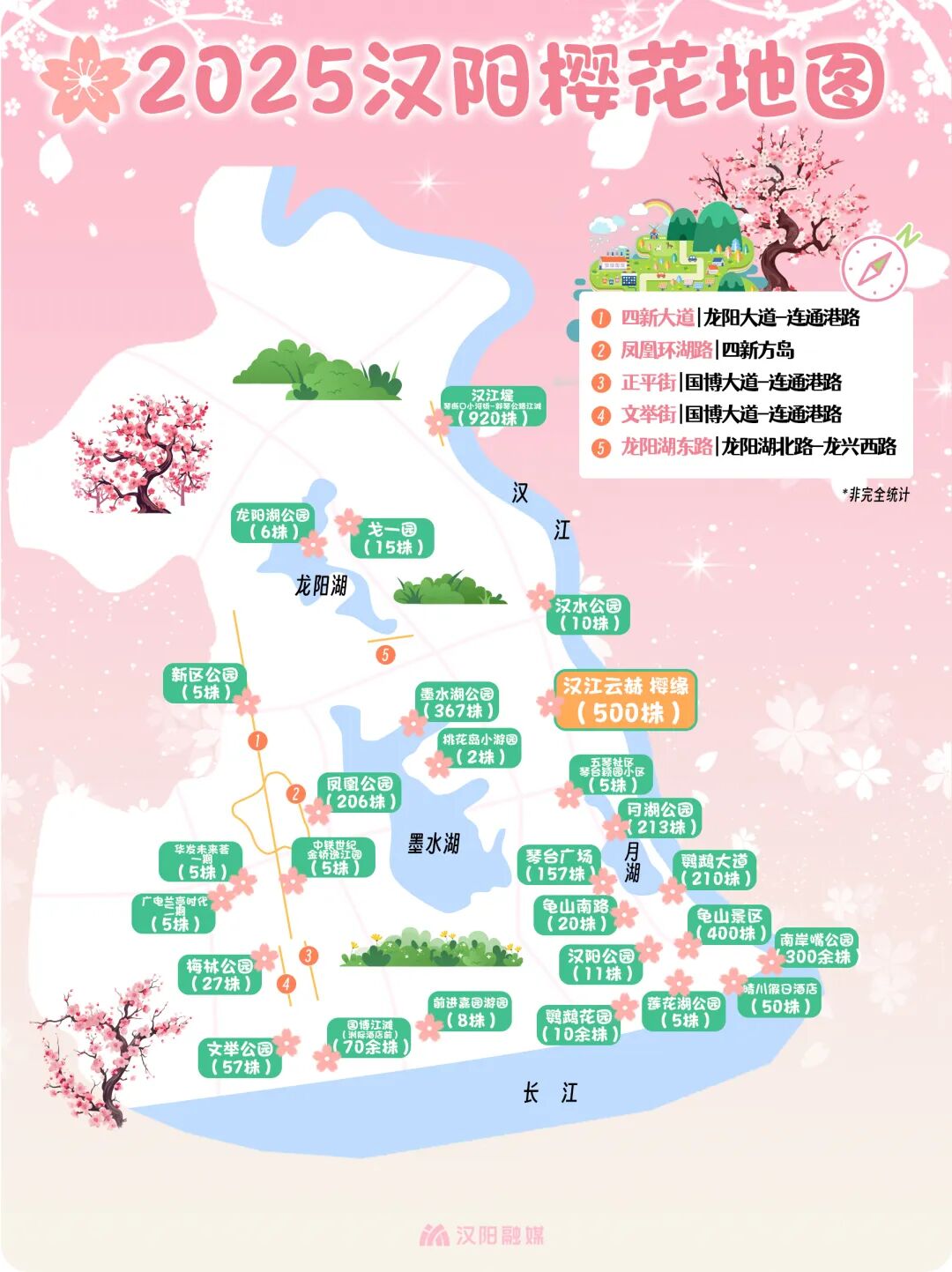 春樱不语自成蹊,半城山水半城花。汉阳以花为媒,邀请来自五湖四海的你,来汉阳,看汉马跑过武汉最美马拉松赛道(鹦鹉大道),感受龟山南麓樱花谷层叠花海,在长江之畔看粉色樱雨。