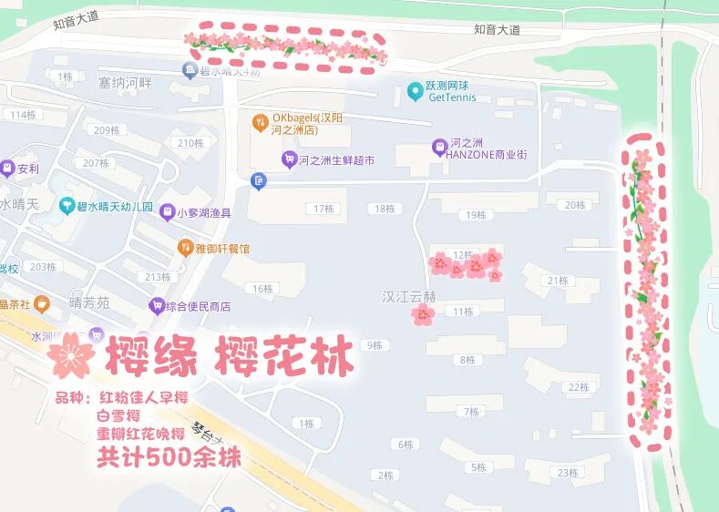 △河之洲HAN ZONE樱缘内樱花分布位置。