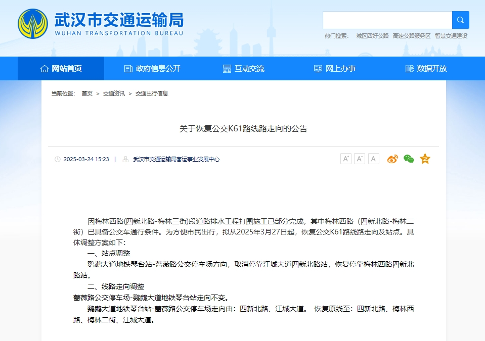 鹦鹉大道地铁琴台站-蔷薇路公交停车场方向,取消停靠江城大道四新北路站,恢复停靠梅林西路四新北路站。