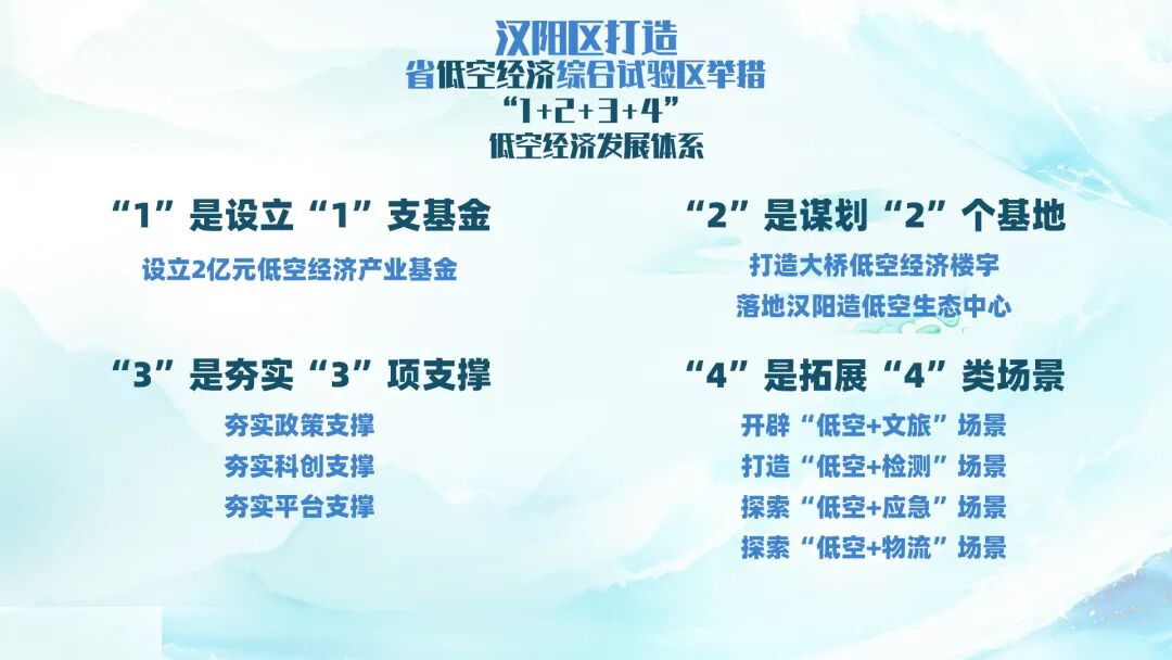 抢滩“低空”新蓝海,打造立体文旅新场景,汉阳区发布打造省低空经济综合试验区举措,构建“1+2+3+4”的低空经济发展体系,即设立“1”支基金、谋划“2”个基地、夯实“3”项支撑、拓展“4”类场景,实施“聚链、强基、拓景、优生态”四大行动,构建低空经济全生命周期闭环等一系列举措,为湖北省抢占新质生产力高地注入汉阳动能。