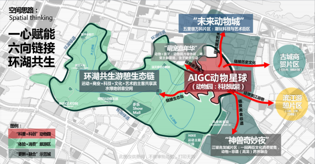 汉阳区文旅局发布环动物园文旅圈产业规划,动物园片区拟围绕“亲子、运动、创意”三大主题词,通过数游赋能、延链补空、引线搭桥,整合区域商文旅资源,打造“科普+科创”动物园、“体验+消费”旅游区、“更新+融合”示范区,形成“一心赋能、六向链接、环湖共生”的空间规划思路。围绕动物园提升打造AIGC动物星球,围绕水路交通串联,丰富创意体验空间,形成环湖共生游憩生态链。让环动物园文旅圈形成“以文旅带流量、以场景促产业”的引领效应。