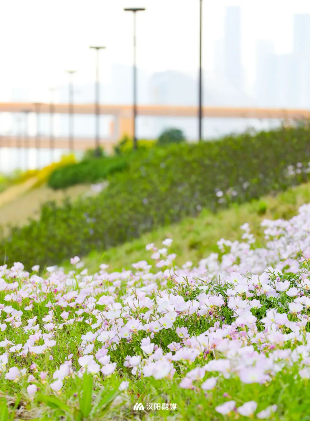 月见草沿着地势开放,阳光透过树叶洒下来,堪比柔光滤镜。花海尽头是湛蓝的江水,恍惚好似“海边”。