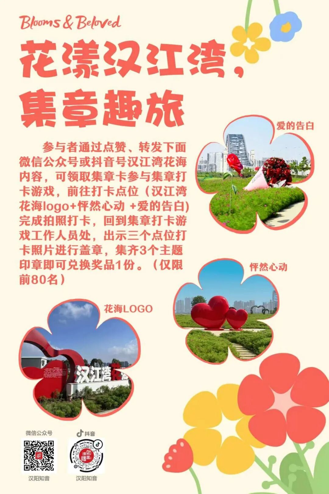 花海集章别错过,只要在「花海LOGO」、「怦然心动」、「爱的告白」三个打卡地合影,集齐主题印章便可兑换惊喜奖品,名额仅限前80名,先到先得。