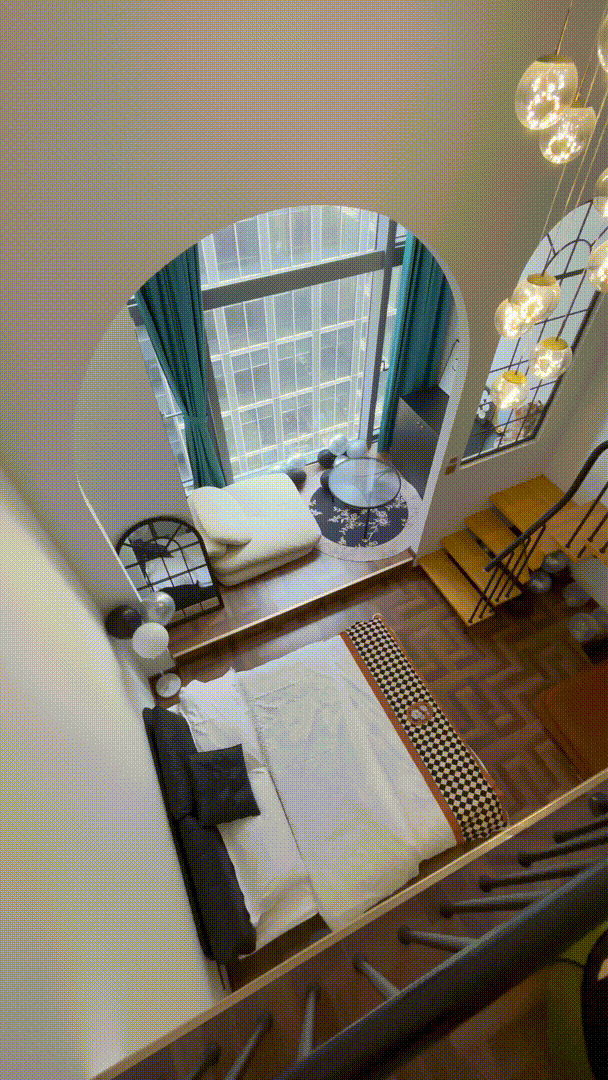 挑高的loft空间里,超大超高落地窗,推窗便可看到归元寺赫然眼前。下层客厅简约但温馨,白沙发散发着无可抵挡的松弛魅力,上层卧室就像一个安静的小城堡,助你一秒入眠。