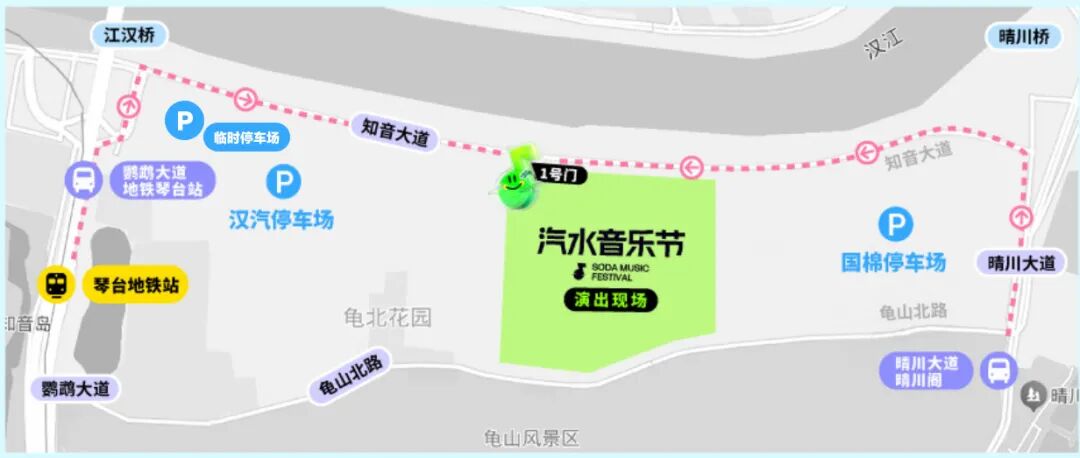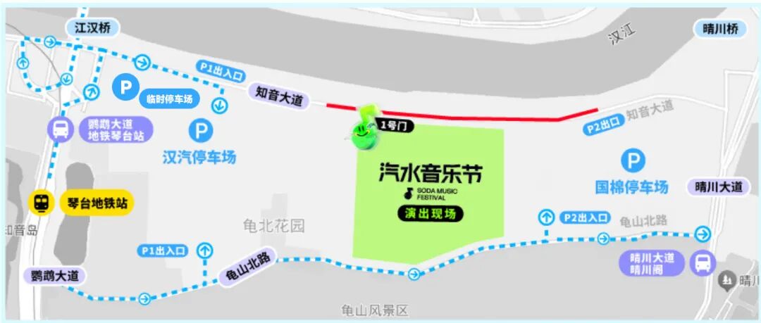 地铁6号线至「琴台地铁站」B出口,出站后根据沿路铺设的道路指引牌,步行前往活动场地1号门检票入场。