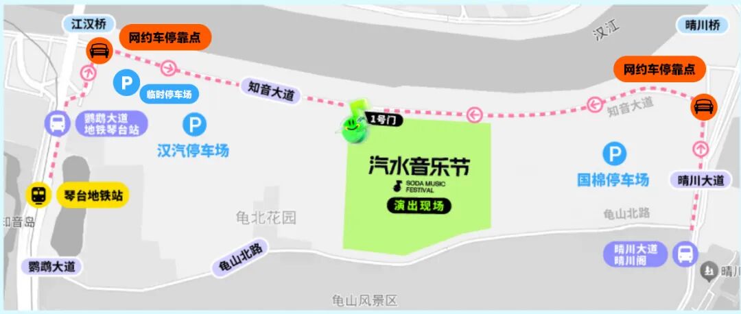 ③现场临时增开了一个停车场——临时停车场,车位数200个,进出口在知音大道上。温馨提示:演出当天周边交通压力较大,部分路段将临时管控,且停车资源紧张,推荐乐迷朋友尽量搭乘地铁、公交等公共交通工具出行。具体收费标准以实际停放停车场的规定为准。