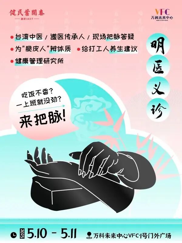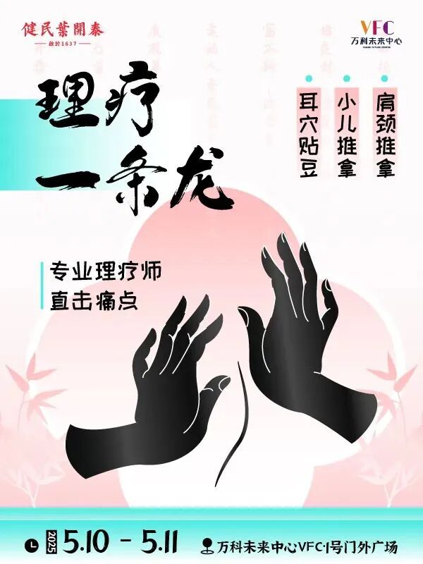 首冲明医义诊,现场把脉,提供专属养生建议。理疗外治则直击痛点,耳穴贴豆、肩颈推拿超舒爽。