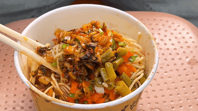 加一勺卤水,拌匀后每根面条都裹满了酱汁,碗底不会有多余的汤汁,干湿合理。值得一提的是他们家的秘制辣椒油,往碗里加上几勺,相当到位。