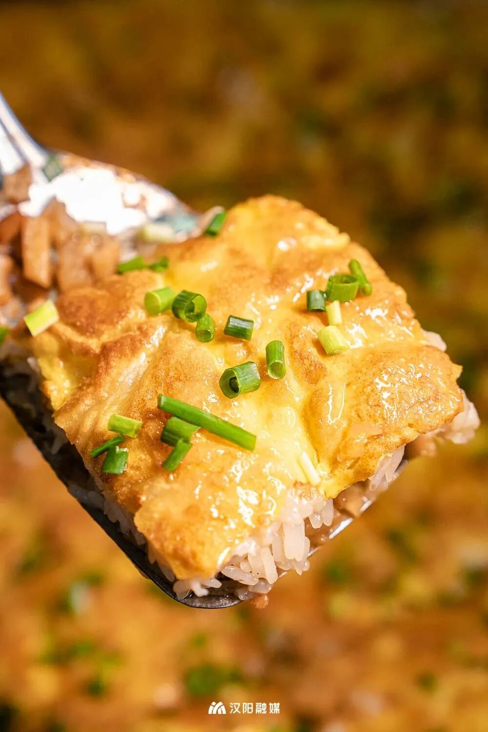 老板一把锅铲快速拨匀糯米馅料,最后在空中一颠锅,糯米馅料在下,金黄灿灿的豆皮在上,看的人直流口水。