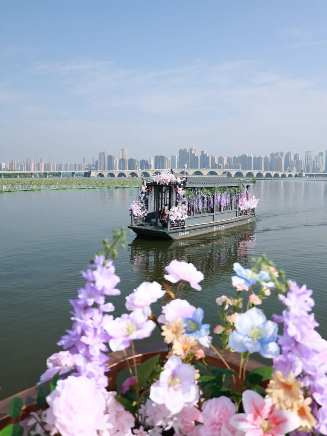 现场,画舫游船化身"水上花神",船头垂落花瀑,窗棂缠绕月季藤蔓,各色繁花同绽一船。鲜花映入湖面,风过处,湖面掀起波澜,与身后的墨水湖大桥相映成趣,勾勒出一副灵动绚丽的画卷。
