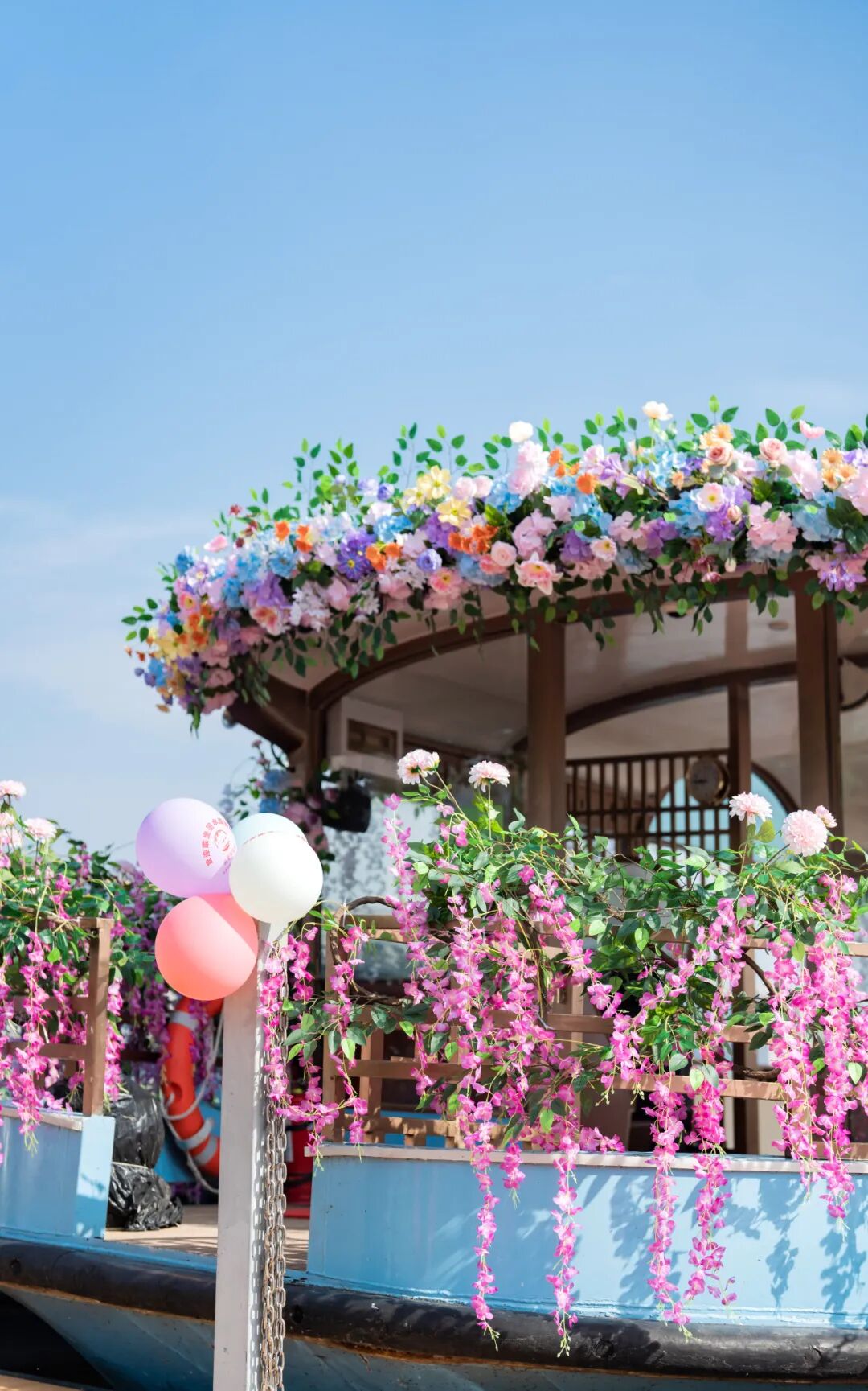 △今天现场,为相亲交友活动打造的520花船,属于墨水湖·平塘古渡游船项目的画舫船定制服务。