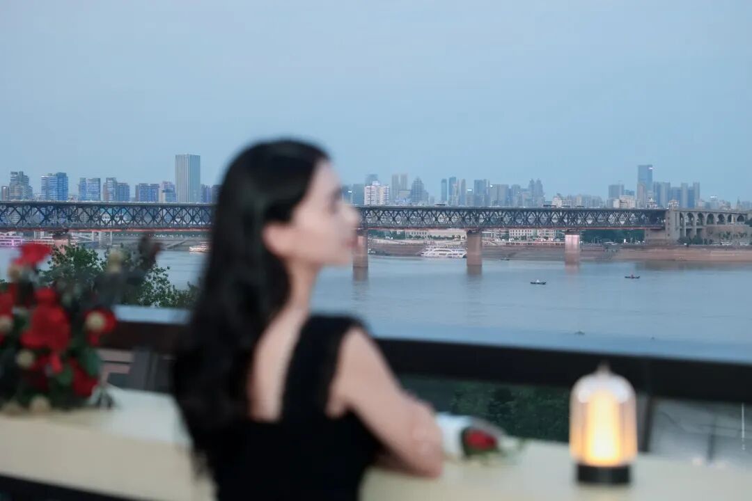 登上四楼,全景巨幕落地窗,伫立在落地玻璃前,仿佛与整个浩瀚城市紧密相连。比个心,就能把江对面的黄鹤楼框起来。
