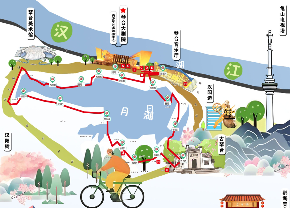 琴台大剧院·琴台青少年体验中心(起点)→琴台美术馆→绿水青山石碑→琴台公园出入口→梅子山栈道→莲花湿地→音乐森林→凤凰广场→琴台气象站→古琴台→知音岛→湖中亭→琴台音乐厅→琴台青少年体验中心(终点)