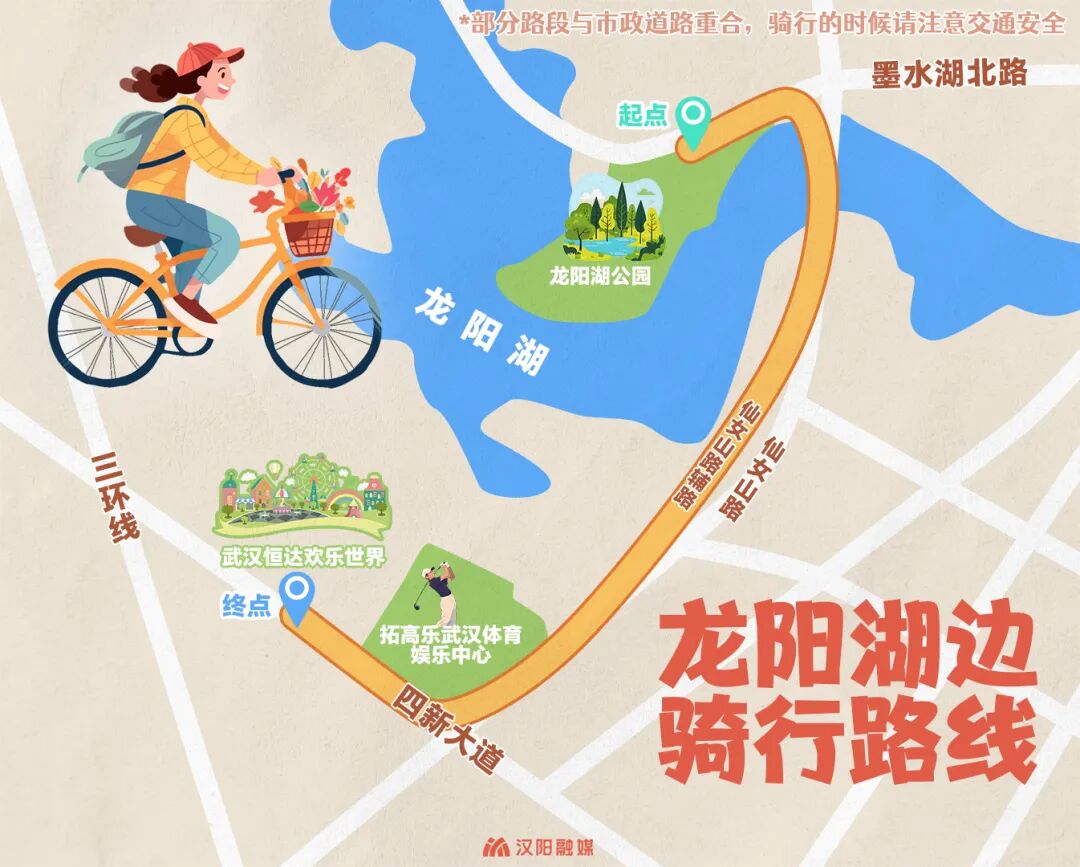 龙阳湖公园龙阳半岛是露营的好地方,公园内不能骑行,汉阳君推荐一条外面骑行线路,能探桥下秘境,拍摩天轮,终点还有超大游乐园,超适合亲子骑行。
