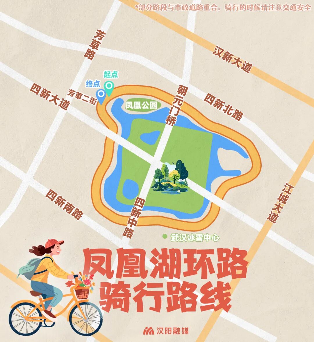 汉阳君将骑行起点设置在今年新开的「凤凰公园」,公园一只彩绘大翅膀,辨识度极高。看着凤凰湖环路路标,顺时针骑行,岔道也不怕走错。