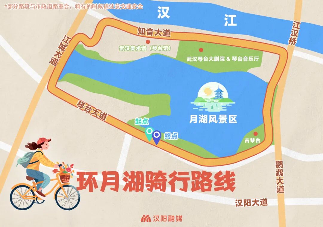 还有余力,你可以沿着知音大道继续,经过「江汉大道」,再下到「鹦鹉大道辅路」,一路来到起点处,给月湖骑行路画上圆满句号。