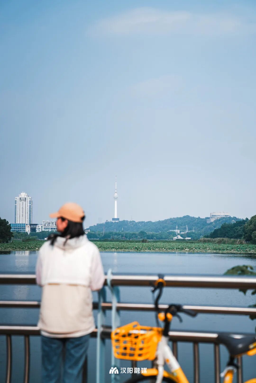 汉阳君一路向西,沿着湖岸线右拐进入「江城大道」,这里是看月湖的全新角度。远方的龟山电视塔露出塔尖,合影一张,超好拍的。
