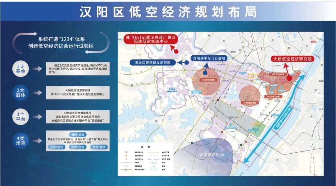 去年底,汉阳成功获批全市首批低空试点空游航线(从南岸嘴起飞)并顺利试飞;省低空经济产业发展联盟成功落户;峰飞航空武汉总装基地签约落户汉阳。