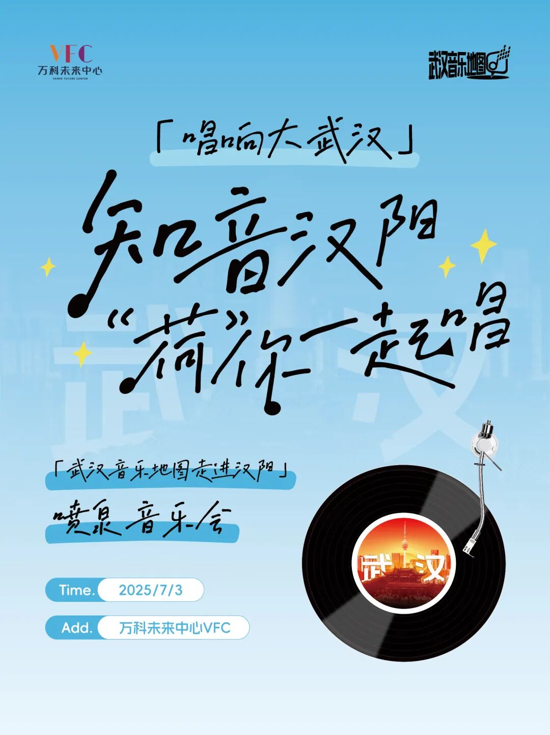 开个好头,7月3日(本周四)19:00,万科未来中心VFC前广场,「知音汉阳,荷你一起唱」喷泉音乐会,武汉音乐地图走进汉阳,邀请来自各地的知音,过夏天,一起唱。