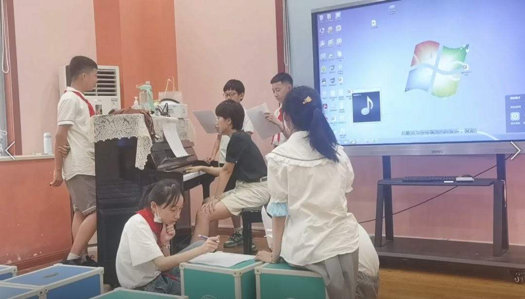△肖玉老师和孩子们讨论谱曲,演唱《幻梦飞行》。