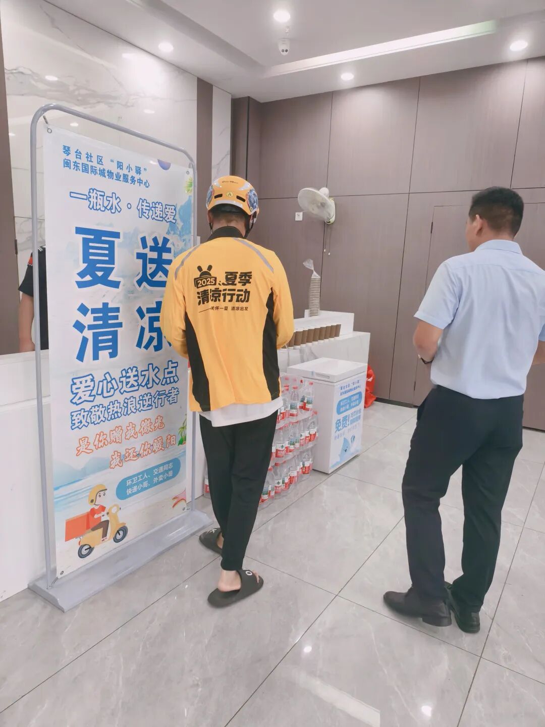 这份清凉与善意,也跨越传递到马路对面。在闽东国际3A大厦一楼大厅的“爱心送水点”,起初只有琴台社区志愿者“孤军奋战”,但短短几天,就汇聚成了整栋楼的“爱心接力”。