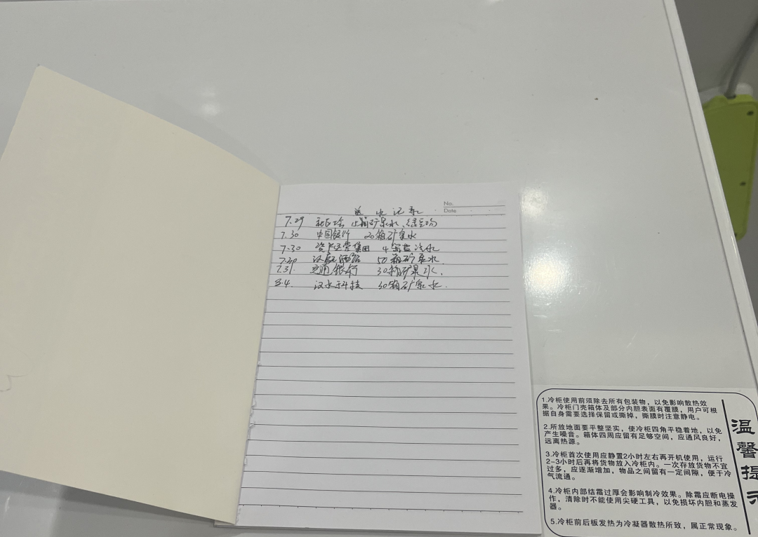 冰柜旁悄然出现的小本子,见证着这份升温的暖意: 7月29日,社区工会:15箱矿泉水、绿豆汤;7月30日,中国银行:20箱矿泉水;7月30日,武汉市工祥资产管理有限公司:4箱咸汽水,汉庭酒店:50箱矿泉水;7月31日,交通银行,30箱矿泉水;8月4日,汉水科技:30箱矿泉水……字迹各不相同,却都透着热辣辣的真诚。
